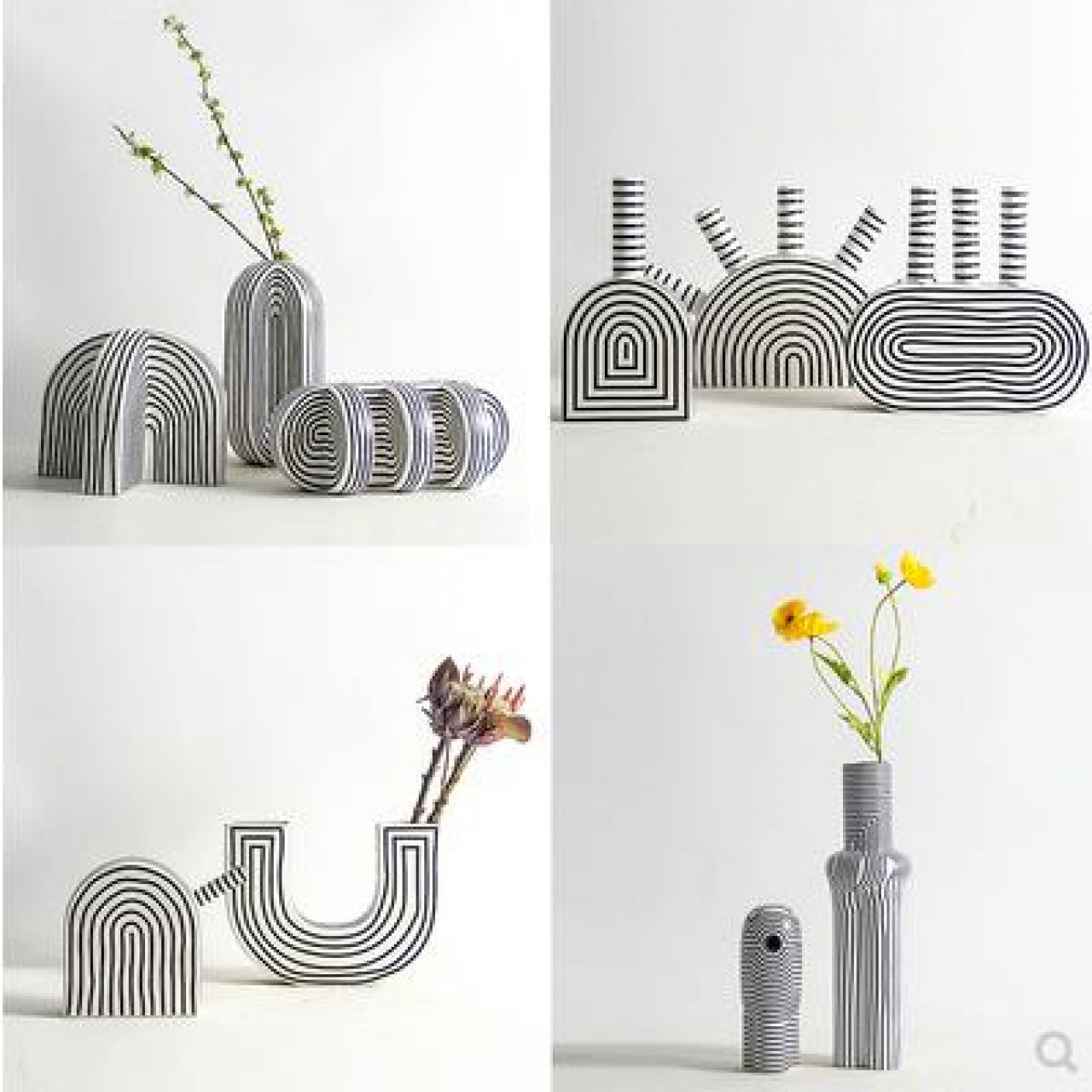 首页> 陶瓷制品> 陶瓷制品> 陶瓷制品> 现代极简约黑白条纹几何陶瓷异形插花器花瓶摆件样板间客厅装饰品